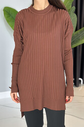 Yırtmaç Detaylı Fitilli Triko Tunik 34121 Kahverengi