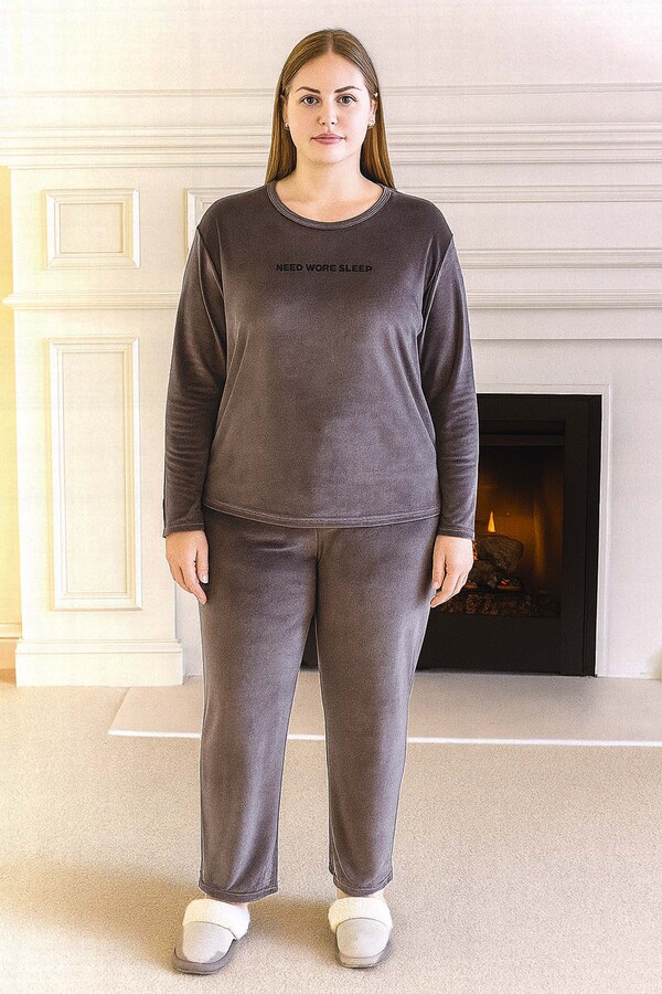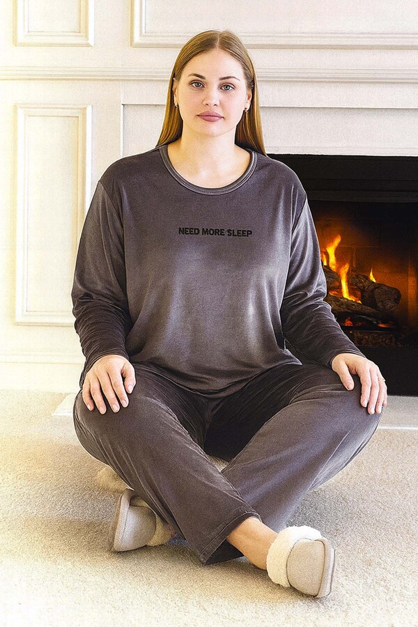 Büyük Beden Kadın Kadife Kumaş Pijama Takımı 13213 Koyu Gri