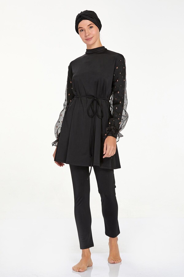 Chiffon Sleeve Detailed Lycra Full Covered Swimwear Beta 4557 Black