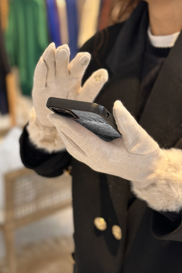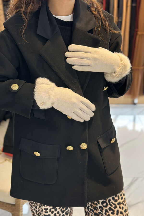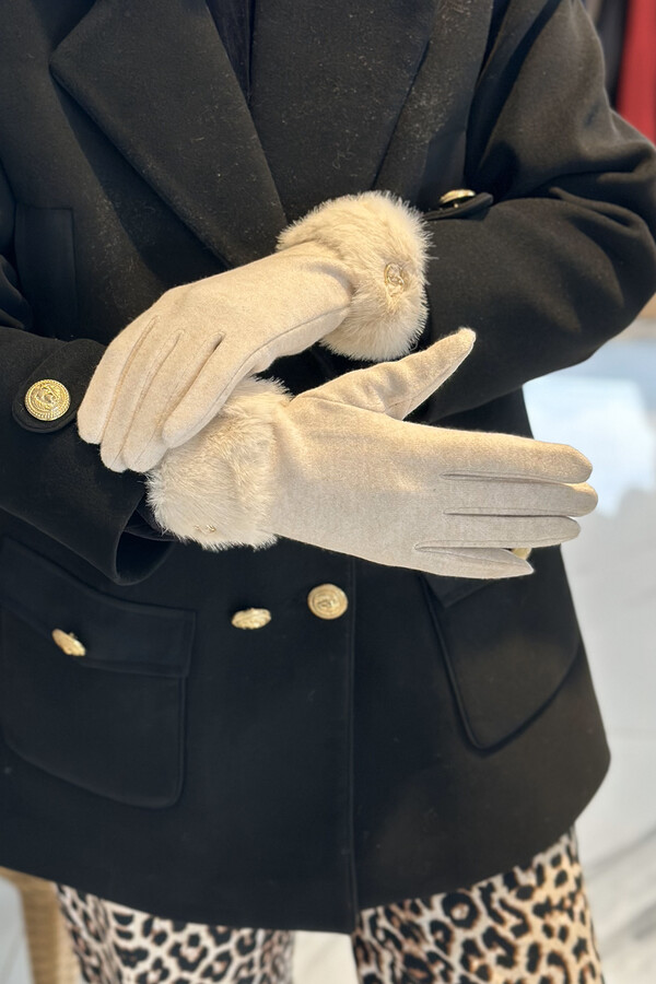 Faux Fur Detail Women's Cashmere Gloves ELD-29 - Beige