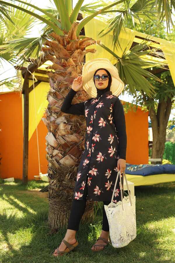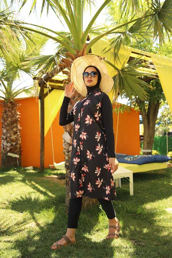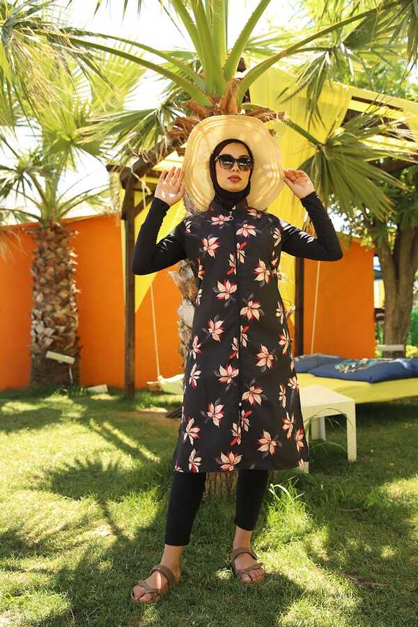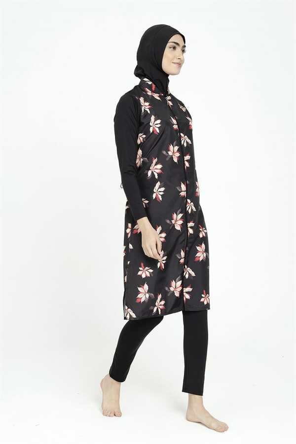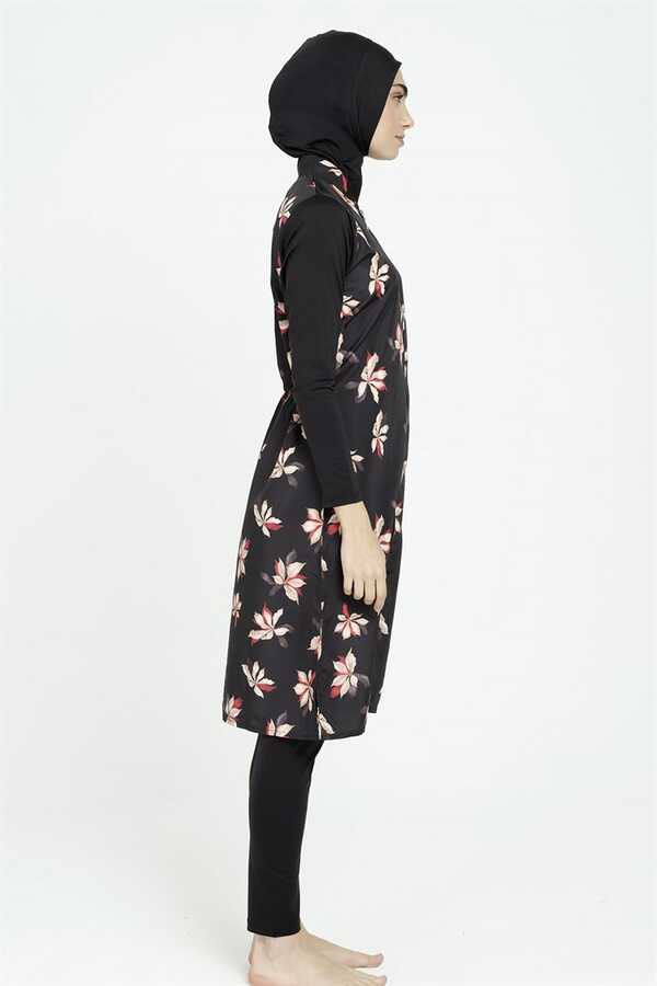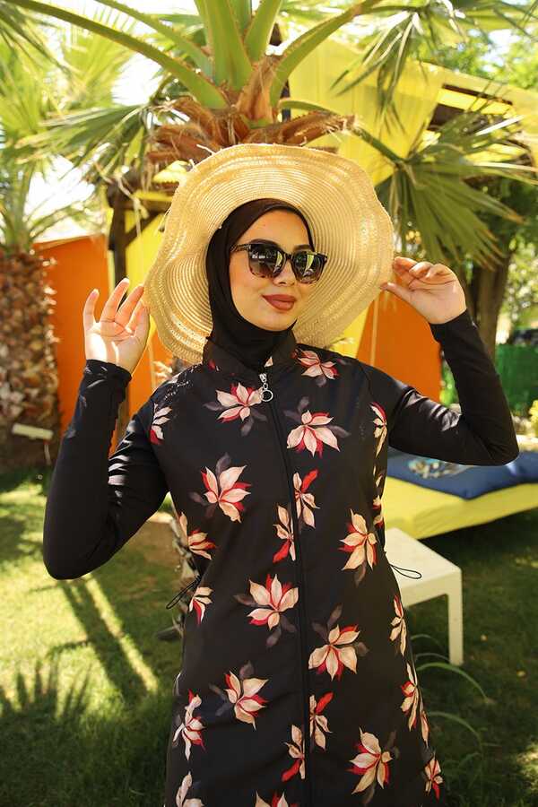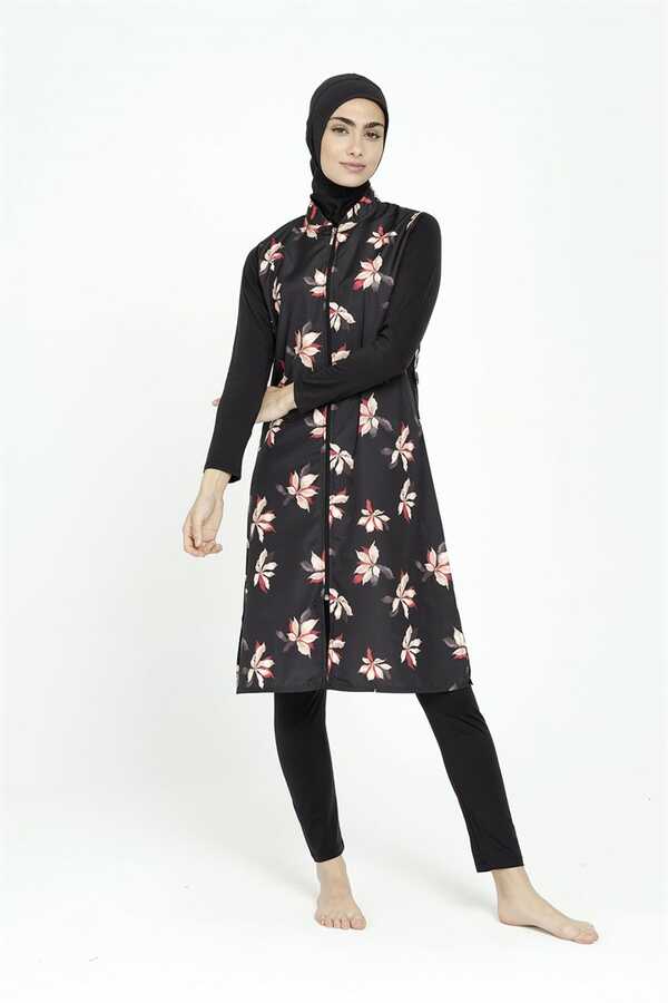 Fermuarlı Paraşüt Tam Kapalı Tesettür Mayo Kırmızı Yapraklı
