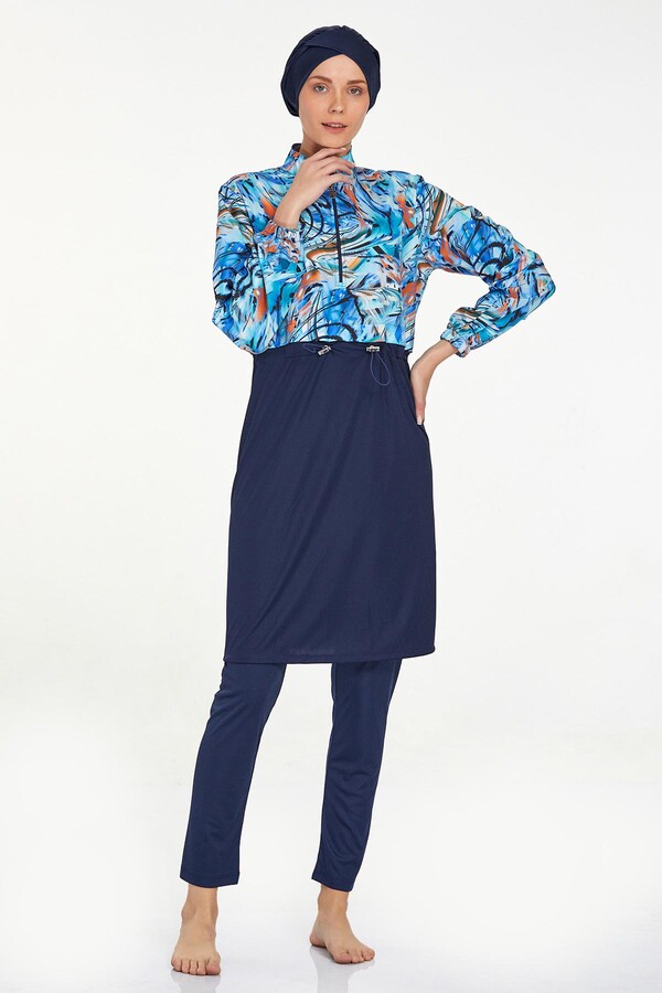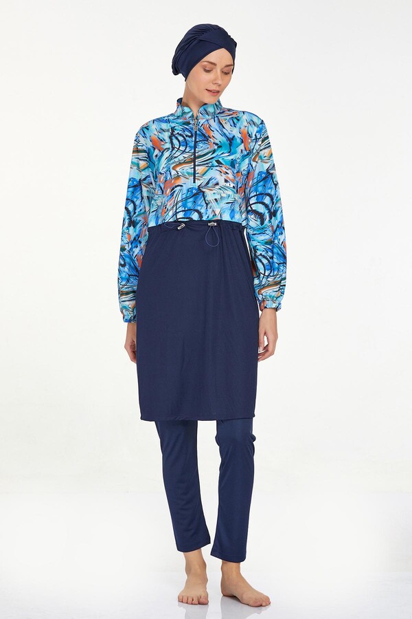 The Full-Covered Modest Swimwear designed by Rozamay for Remsa Swimwear combines elegance and comfort with shades of blue and navy.
