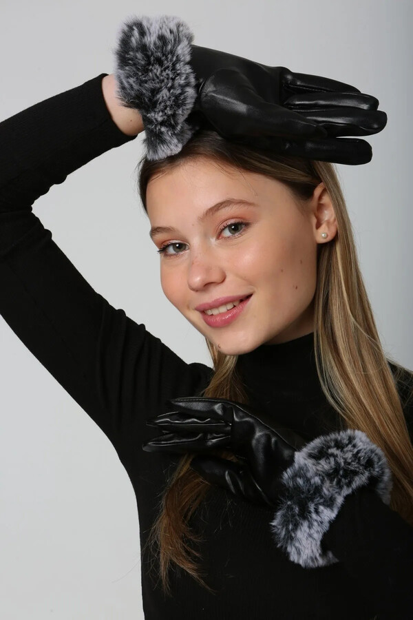 Gri Peluş Detay Kadın Deri Eldiven ELD-19 Siyah