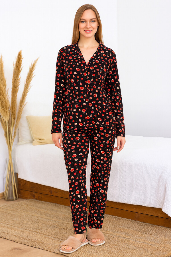 Kadın Çiçek Desen Saphire Düğmeli Pijama Takımı 0468 Siyah04