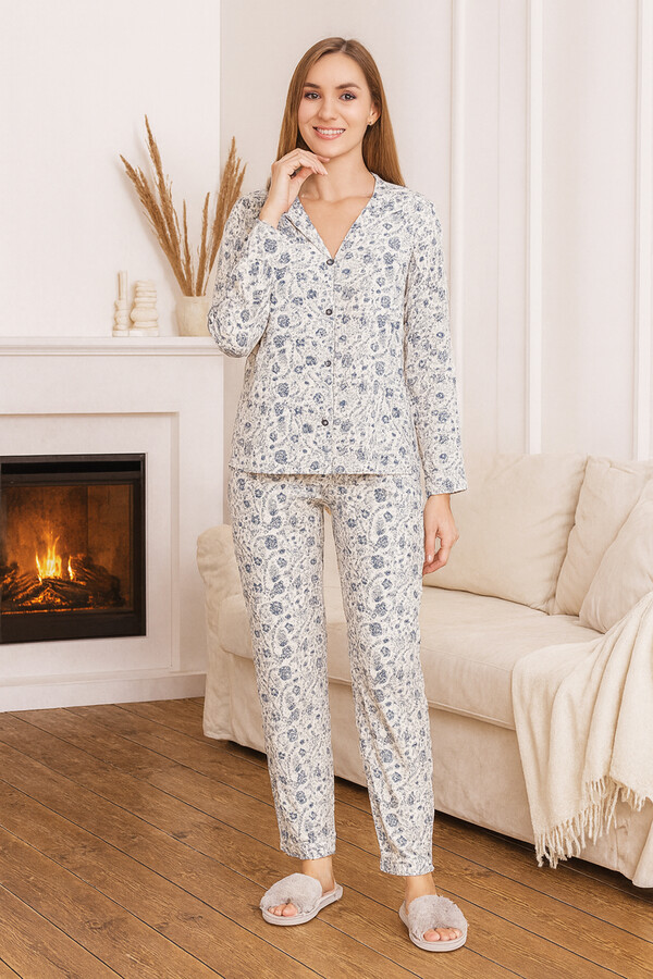 Kadın Çiçek Desen Suprem Önü Düğmeli Pijama Takımı 0469 Beyaz