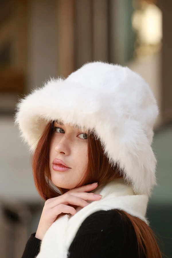 Kadın Peluş Bucket Kalpak Şapka RKŞ-14 Ekru