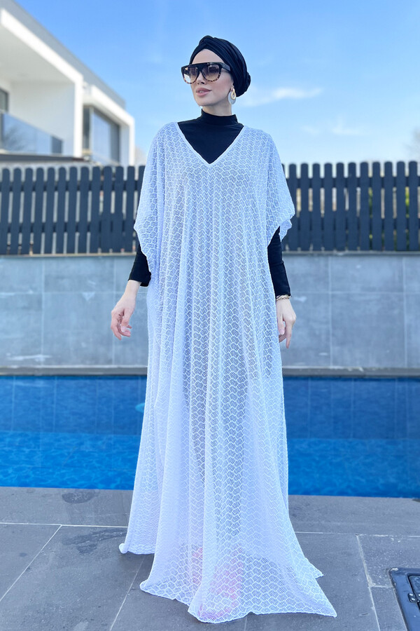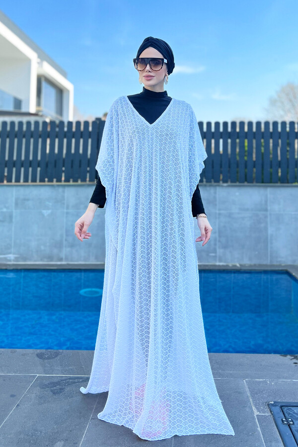 Remsa Swimsuit White Knitted Kaftan Pareo is an ideal accessory that offers elegance and lightness at the beach and poolside in summer. This special pareo is produced using a slightly stretchy tulle knitted tricot fabric, providing comfort and convenience.