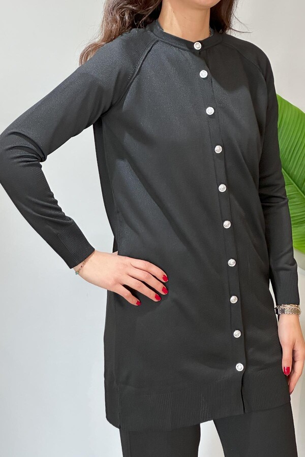 Knitwear Cardigan 01 Black It is a model that you can combine either sporty or stylish. It is knitwear. Sizes: 1-2. There are button details on the sleeves and shoulders. Fabric Information: 65% Viscose 35% polyamide During use, attention should be paid to bags, accessories or jewelry. WASHING INSTRUCTIONS: -It should be washed upside down in warm water. -In the heater etc. Do not dry in direct sun.