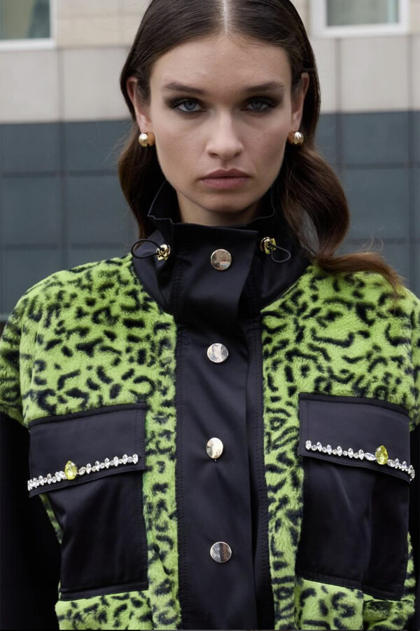 Missemramiss Fur-Trimmed Leopard Coat 4663 Green
