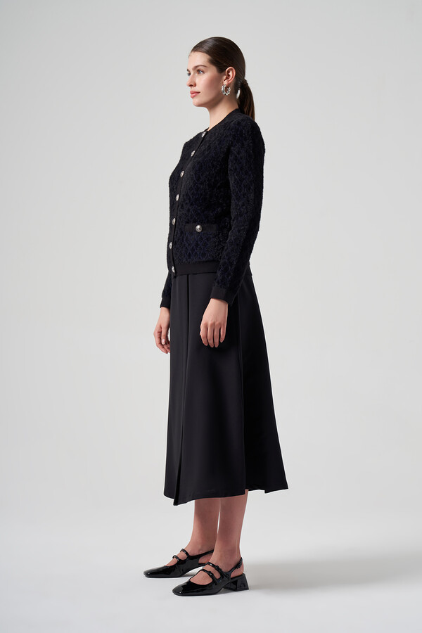 The Nuss Knit Button Detail Short Cardigan 7002 is a versatile piece that can be styled both elegantly and casually.