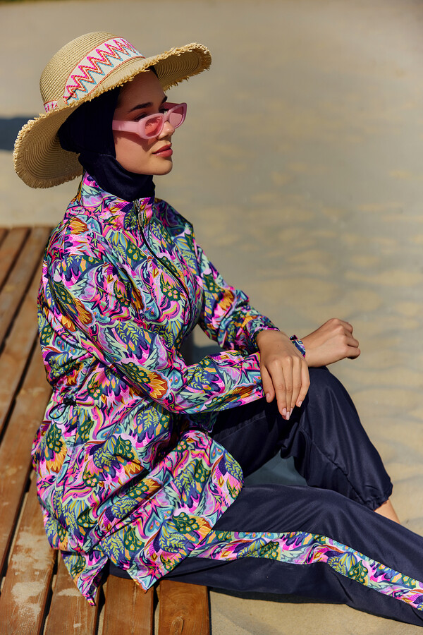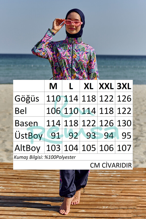 Available in sizes from M to 3XL, this swimsuit adapts to different body shapes. For instance, a medium size measures approximately 110 cm in bust, 106 cm in waist, 114 cm in hips, with a tunic length of 91 cm and pants length of 103 cm. Larger sizes gradually increase, ensuring that every body type can find a comfortable and modest fit.