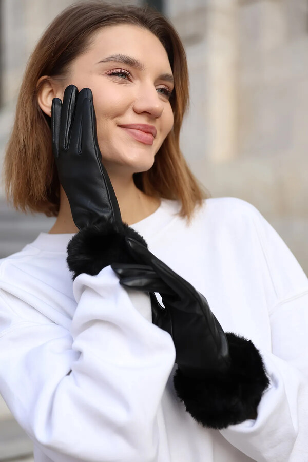 Soğuk havalarda hem tarzınızı yansıtacak hem de ellerinizi sıcacık tutacak bir eldiven arıyorsanız, bu peluş detaylı kadın deri eldiven tam size göre.