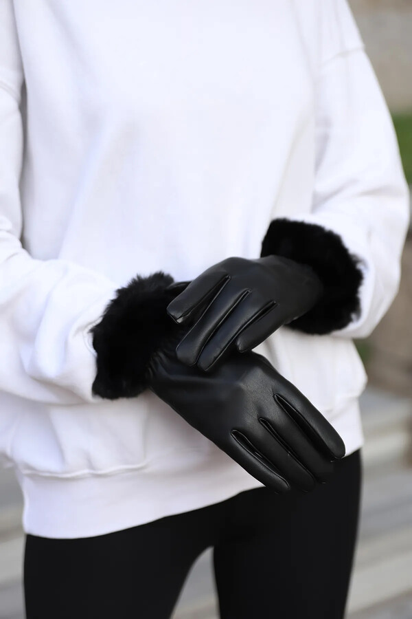 Peluş Detay Kadın Deri Eldiven ELD-20 Siyah