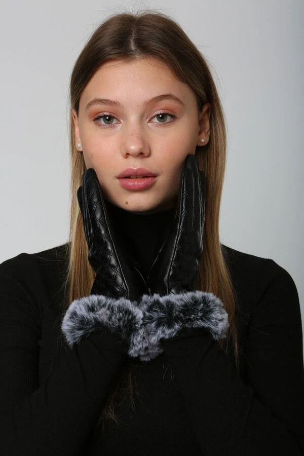 Peluş Detay Kapitone Desen Kadın Deri Eldiven ELD-12 Siyah