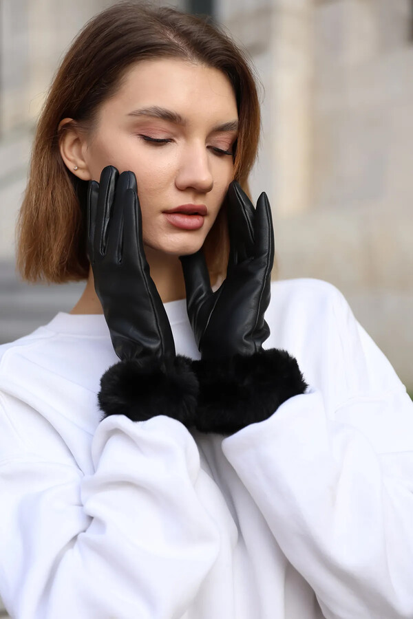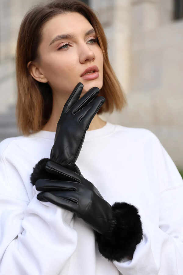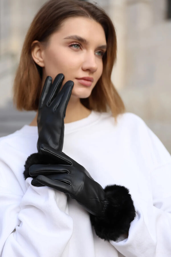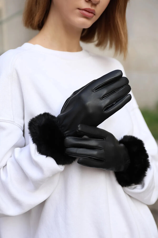 Plush Detail Women's Leather Gloves ELD-20 - Black