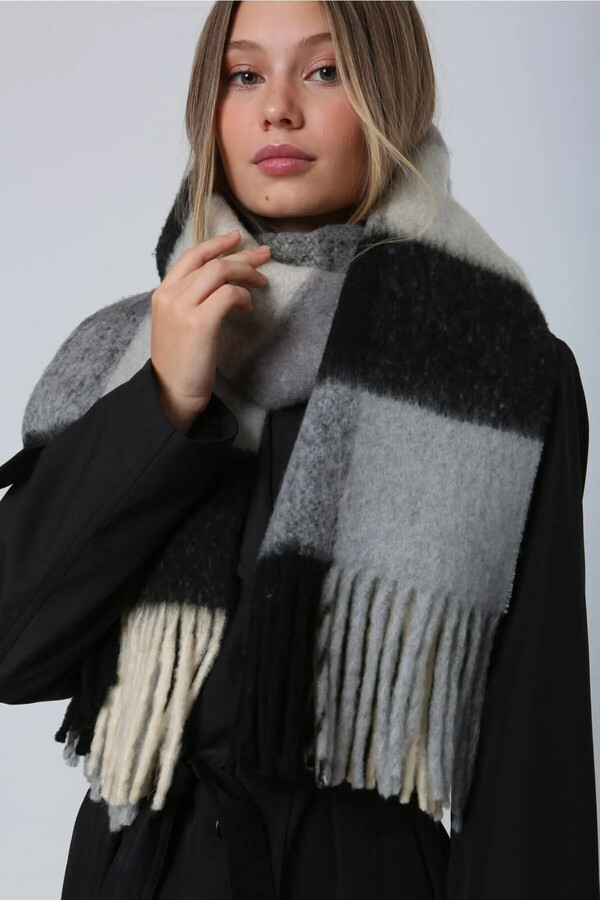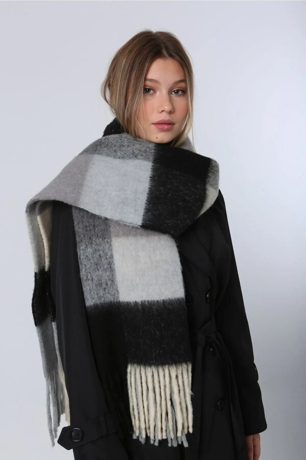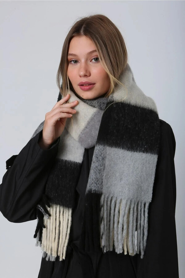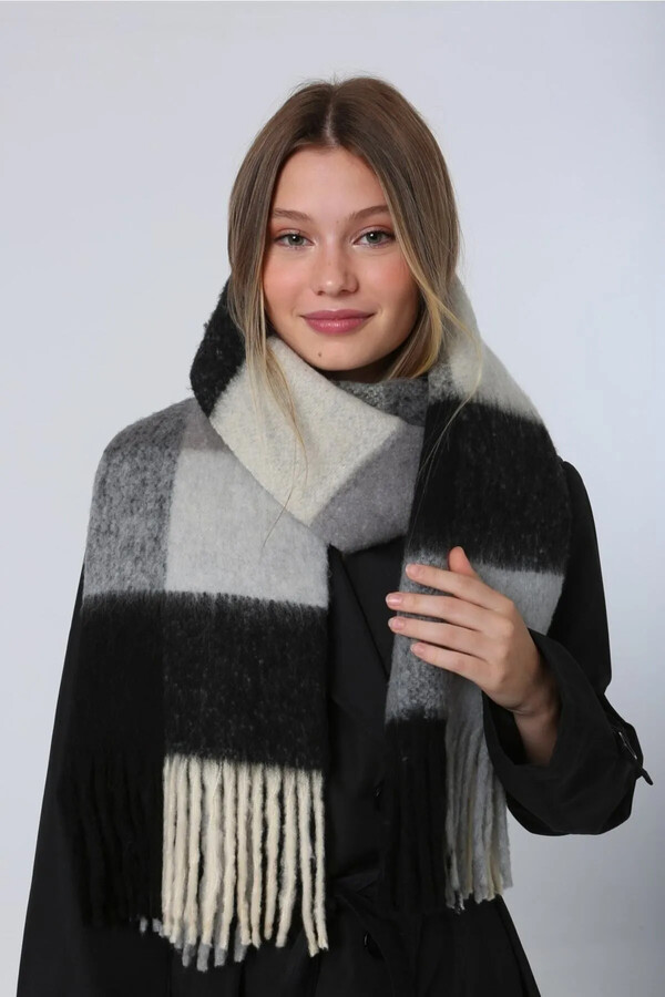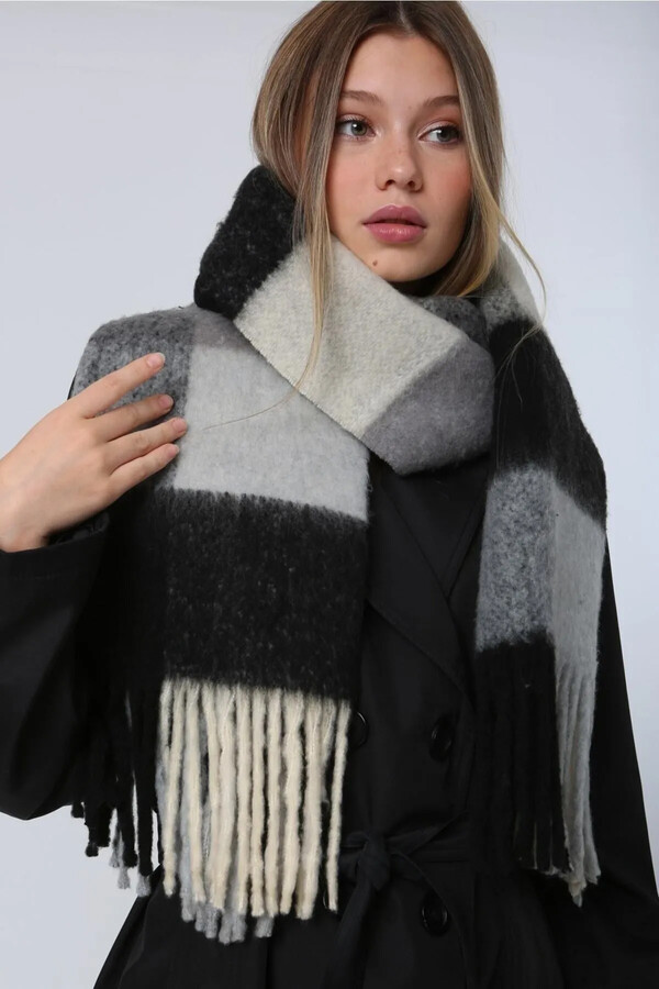 Siyah, beyaz ve grinin eşsiz uyumu kullanılarak tasarlanmış püsküllü desenli şal tek parça olarak satışa sunulmuştur. %100 akrilik kumaş içeriğine sahip bu ürün 45x200 cm civarındadır. Soğuk havalarda sizi soğuktan koruyacak olan bu ürün uygun yıkama talimatları ile uzun ömürlü kullanım sunar.