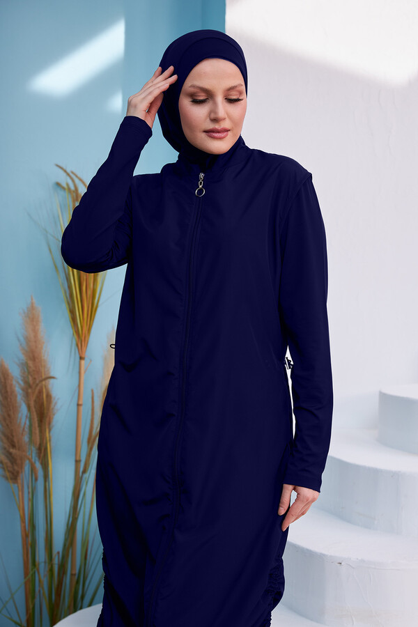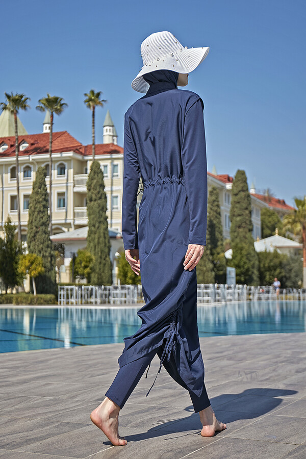 Enjoy the beach and the pool to the fullest with a specially designed fully covered hijab swimsuit that will meet both your elegance and your need to cover up in the summer months. The body part is made of parachute swimsuit fabric, the tights and sleeves are made of lycra swimsuit fabric. In this way, it fits your body perfectly and offers freedom of movement. You can adjust it the way you want thanks to the drawstrings at the hem. Adjustable elastics at the waist provide comfort and flexibility. The product consists of tube bottom bottom, top full length tunic, bonnet and scarf, thus offering a complete hijab swimsuit set. It provides a practical use with its fast drying feature.