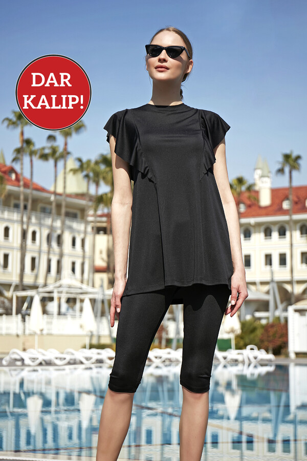 Consists of Frill-detail Top, Capri Tights, and Inner thin bustier, totaling 3 pieces.
