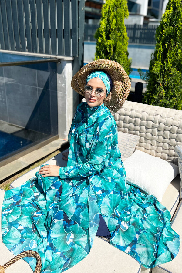 Remsa Mayo Tesettür Mayo Üzerine Desenli Tek Kaftan Pareo Hawaii 430-133 Yeşil