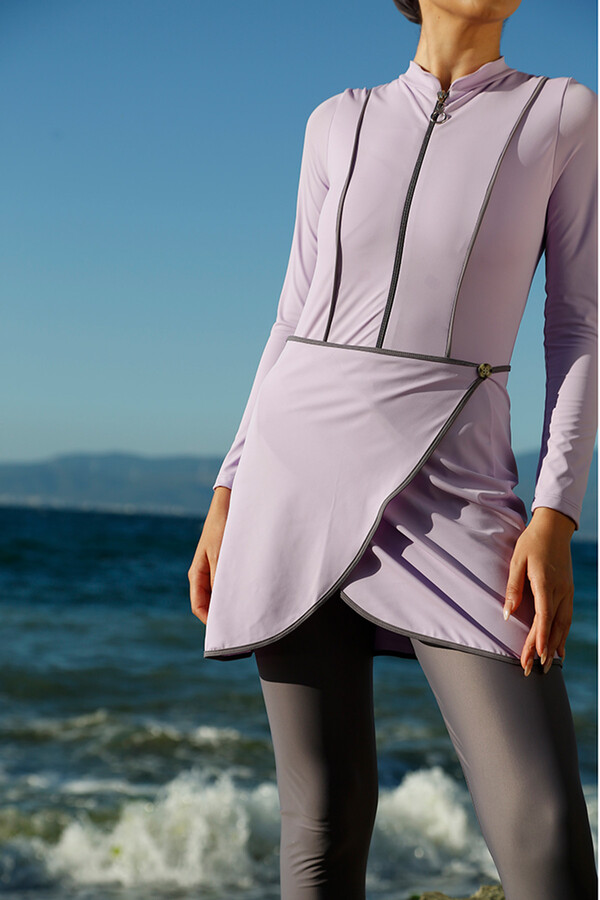 One of the trendy fully-closed hijab swimsuits of the new season, the 3-piece skirted swimsuit set consists of 4 pieces: zippered top, tights, bonnet and skirt. Our product, which is produced from the highest quality lycra swimwear fabric, offers you a pleasant swimming experience in the sea or in the pool. Our sporty and stylish product with pastel color tones is produced from 80% polyamide, 20% elastane content lycra woven fabric. Thanks to its flexible fabric with lycra, it can move freely in the water or on the beach, and it allows your freedom of movement not to be restricted.