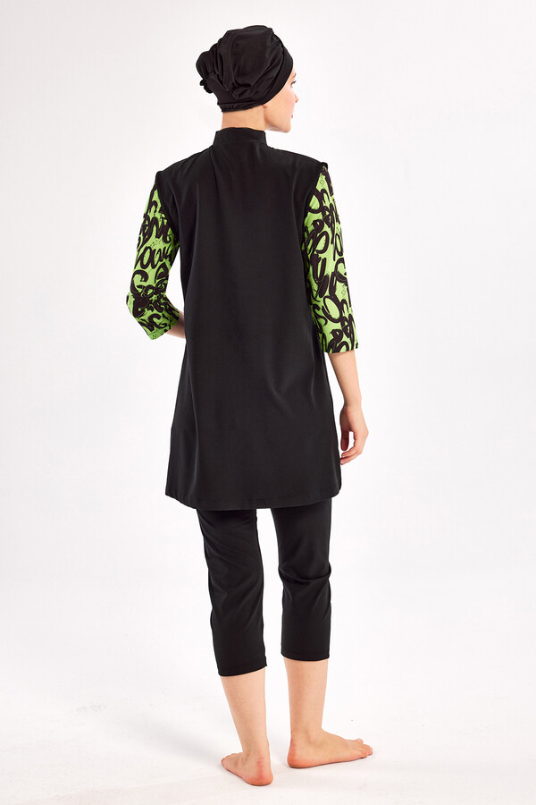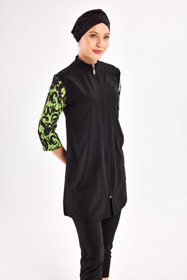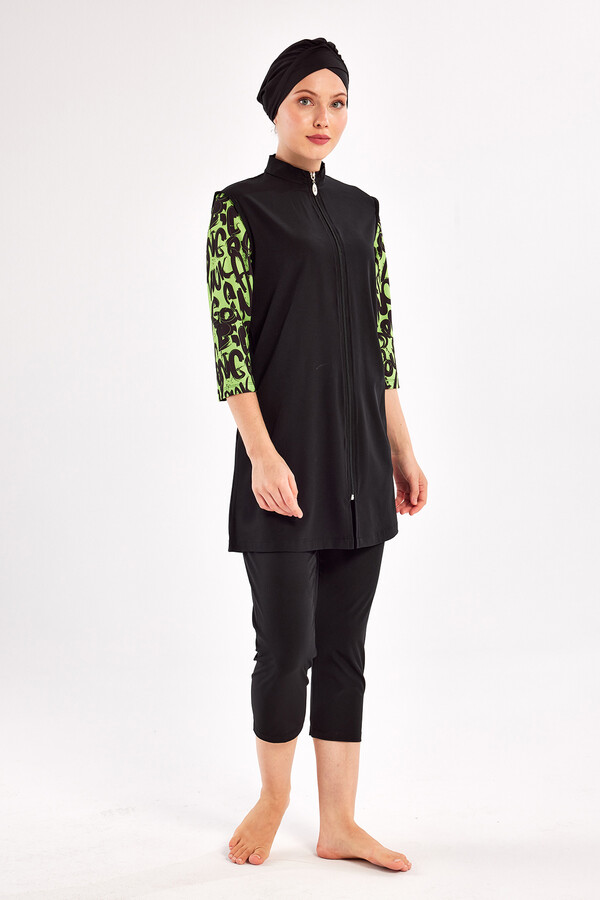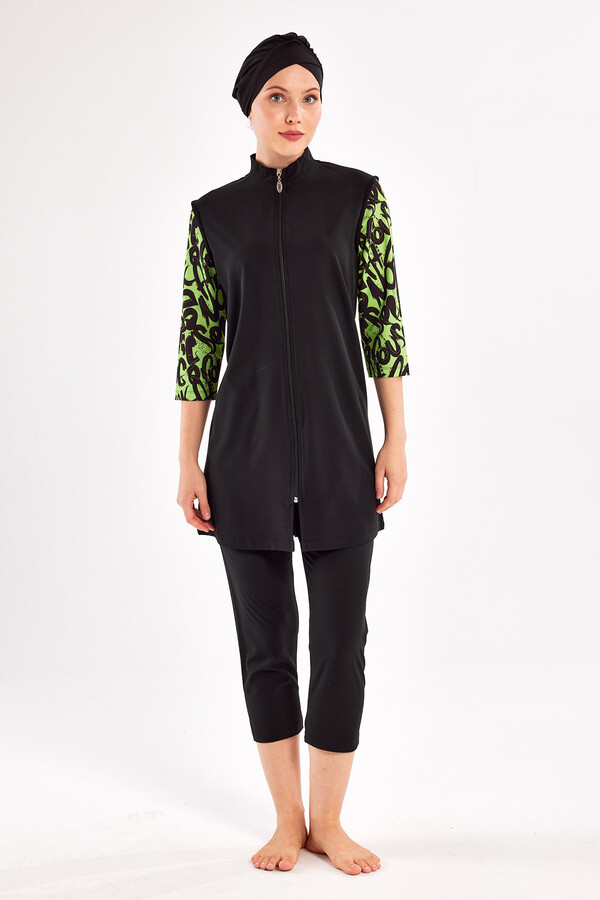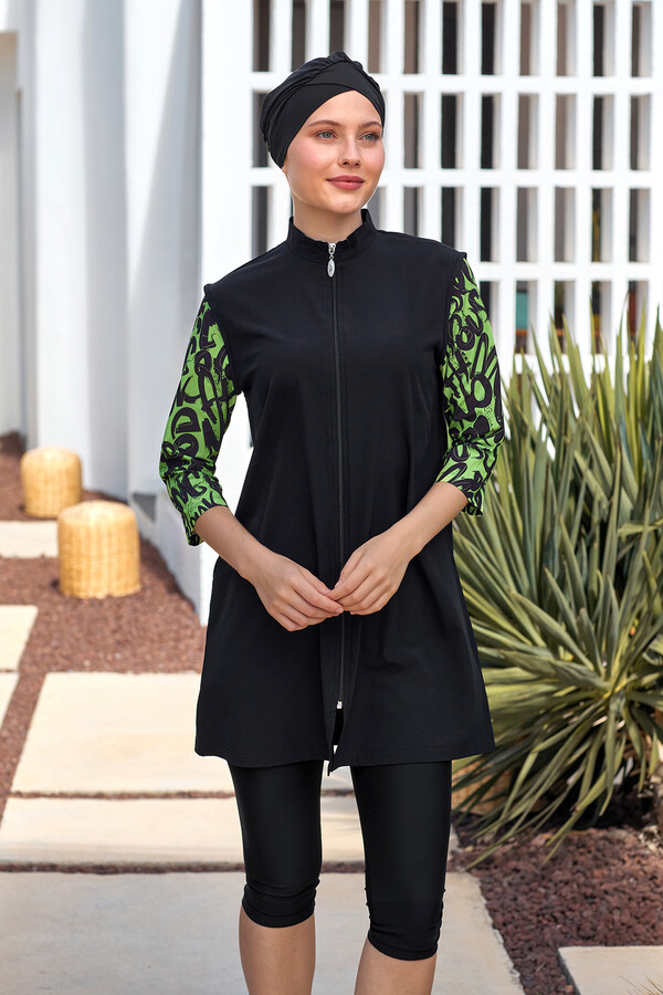 This UV protective sport half-covered swimsuit is designed for active water days, blending practicality with comfort. The 4-piece set includes a zip-front tunic with stylish three-quarter sleeves, fitted tights, an inner bustier, and a matching swim cap. Its sporty look with patterned sleeves adds a modern touch while ensuring full ease of movement.