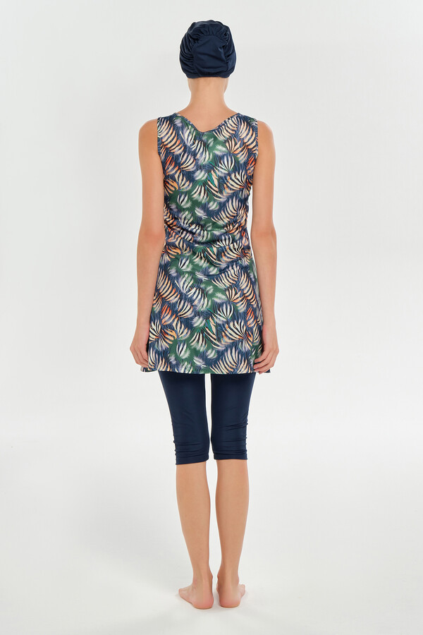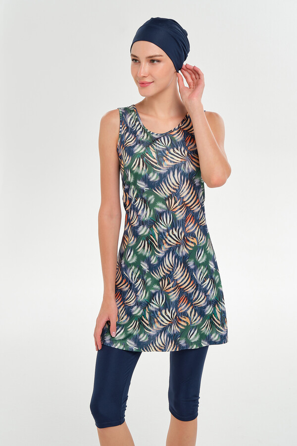 This 3-piece semi-covered swimsuit in dark navy is designed for effortless comfort and style, featuring a sleeveless tunic, cap, and capri-length bottoms. Made with a blend of 86% polyester and 14% elastane, the fabric has just the right amount of stretch to support easy movement while swimming or relaxing by the water. The lycra structure adapts smoothly to your body, giving you a comfortable fit without limiting your motion.