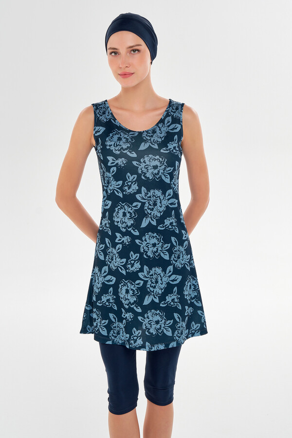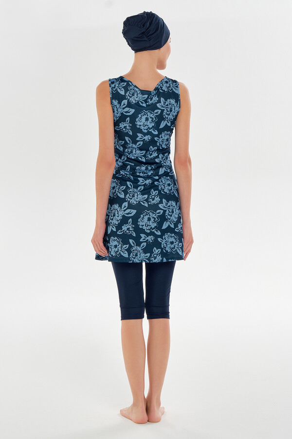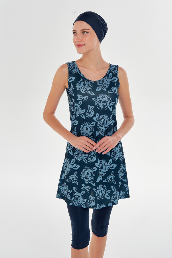 This three-piece semi-covered swimsuit in dark navy comes with a sleeveless tunic, matching cap, and capri bottoms – a set designed for both practicality and comfort. Made from a high-quality blend of 86% polyester and 14% elastane, it offers the flexibility you need for swimming, whether you're diving into the sea, relaxing at the thermal spa, or enjoying a pool day. The stretchy fabric adapts to your movements, so you never feel restricted, and its quick-dry feature makes it super convenient after swimming sessions.